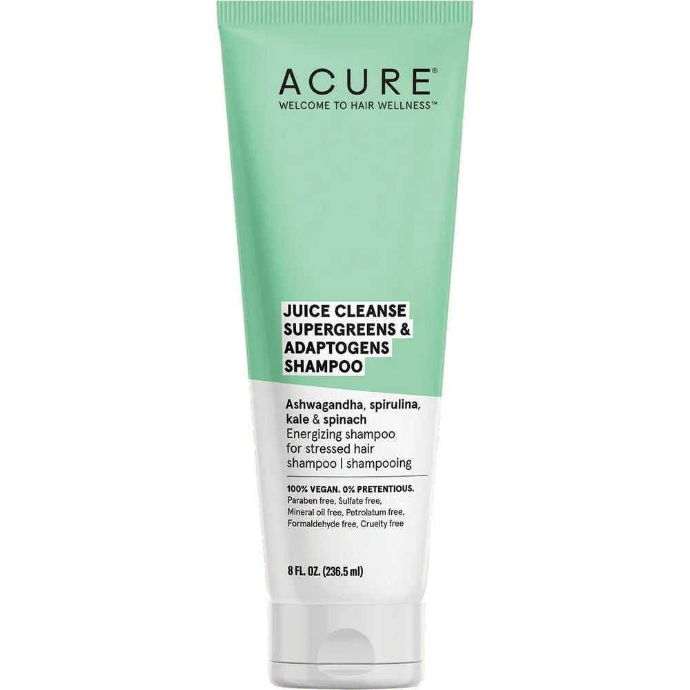 Acure Juice Cleanse Supergreens & Adaptogens is an antioxidant shampoo for super stressed hair.