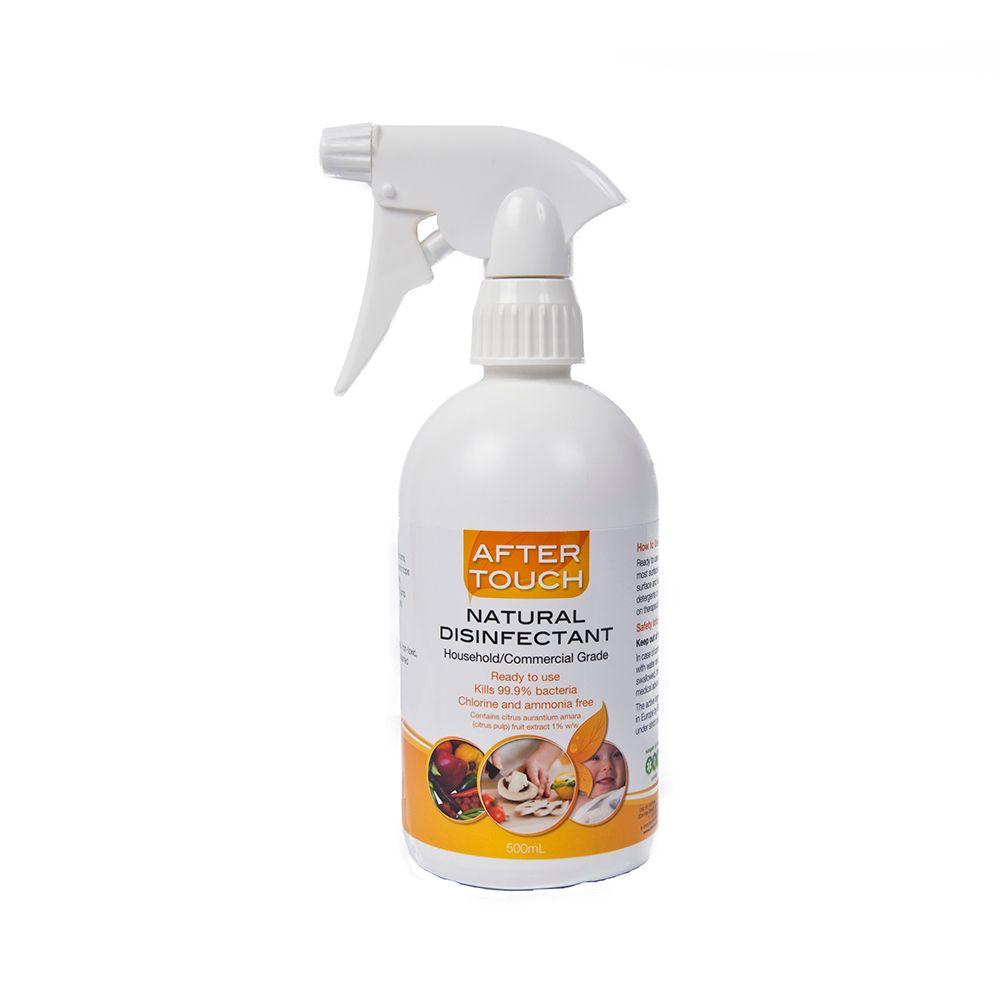 AFTER TOUCH Natural Disinfectant is based on a patented, innovative and proven bacterial control technology to eliminate and control bacterial organisms. Our product is a safe alternative to chemical based surface sanitisers. Natural Disinfectant – Ready to use spray is safe to use on all surfaces and equipment. Spray onto the surface and allow to drain off.