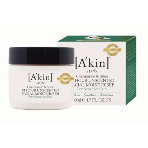 Intensively hydrate and soothe sensitive skin with the help of A'kin Chamomile & Shea 24 Hour Unscented Facial Moisturiser 50ml.