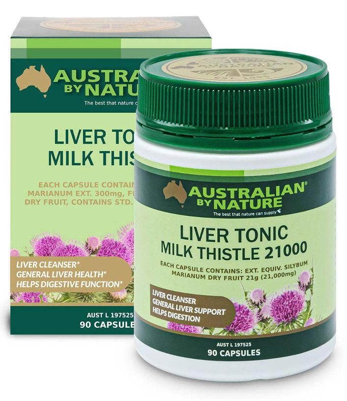 Australian by Nature Liver Tonic is a pure Milk Thistle supplement. Each capsule contains 21,000mg of silybum marianum, standardised to include 150mg of silybin, which is the active component of the Milk Thistle extract. Read more