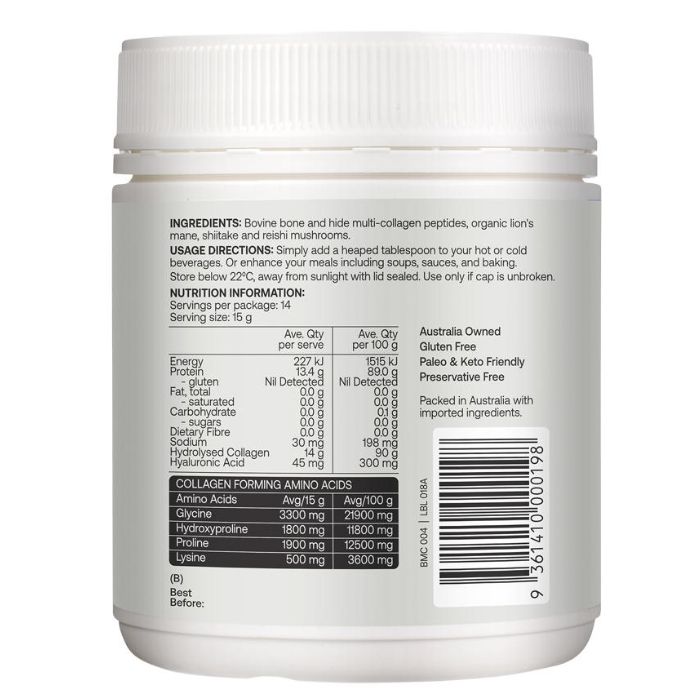 Multi-collagen bovine bone and hide hydrolysed peptide powder, organic Lion's Mane, organic Reishi mushroom powder, organic Shiitake powder.