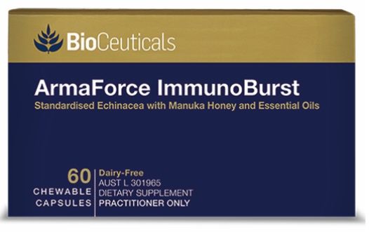 ArmaForce ImmunoBurst are chewable capsules of echinacea in a blend of honey, eucalyptus oil, peppermint oil, menthol and lemon oil. It contains standardised echinacea root that is processed from fresh plant and standardised for potency. These fast acting liquid chewable burstlet capsules are designed for immediate release in the throat.