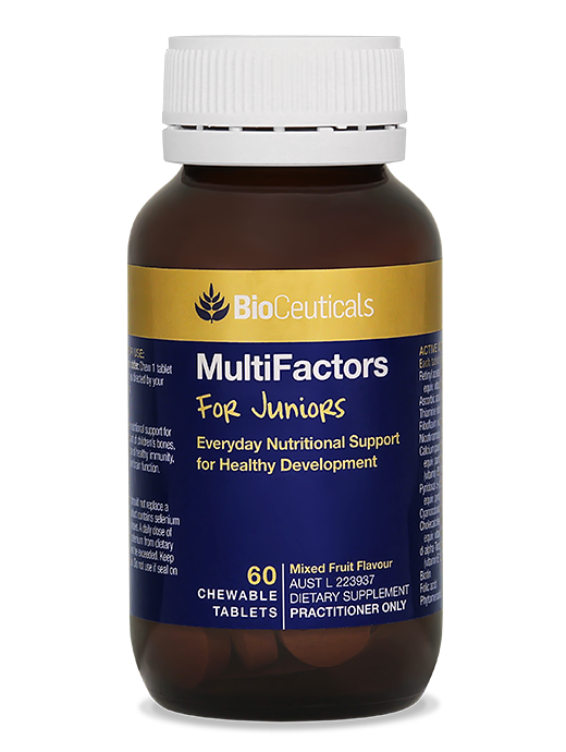 BioCeuticals MultiFactors provides nutritional support for the healthy development of children’s bones, as well as maintenance of healthy immune, nervous system and cognitive function. Chewable tablet in a Fruit Fizz flavour.