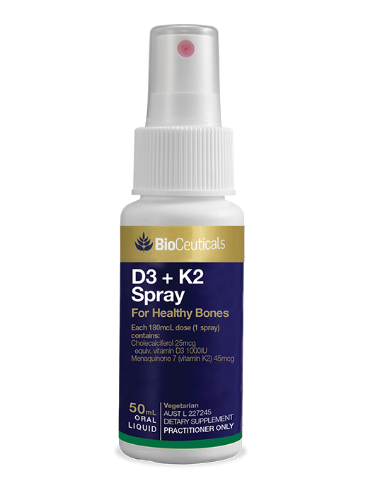 - BioCeuticals D3 + K2 spray supports vitamin D and K levels in the body.