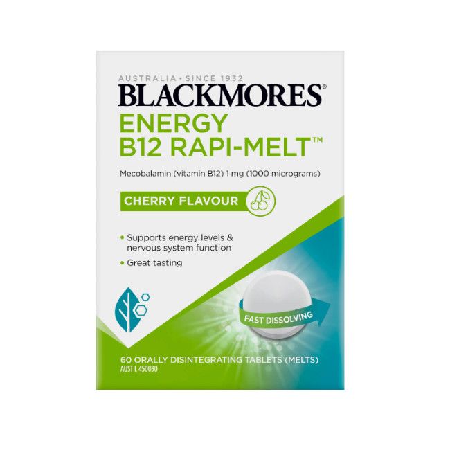 Blackmores Energy B12 Rapi-Melt™ is a high dose formula that contains 1000 mcg of mecobalamin (vitamin B12). This great tasting melt rapidly dissolves on the tongue with no water required, providing you with body ready* vitamin B12 for on-the-go energy support. Halal certified. Read more