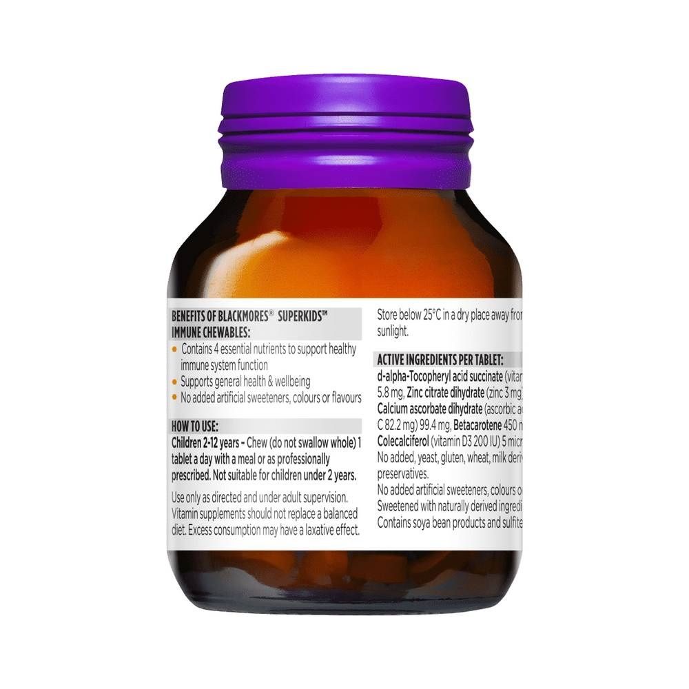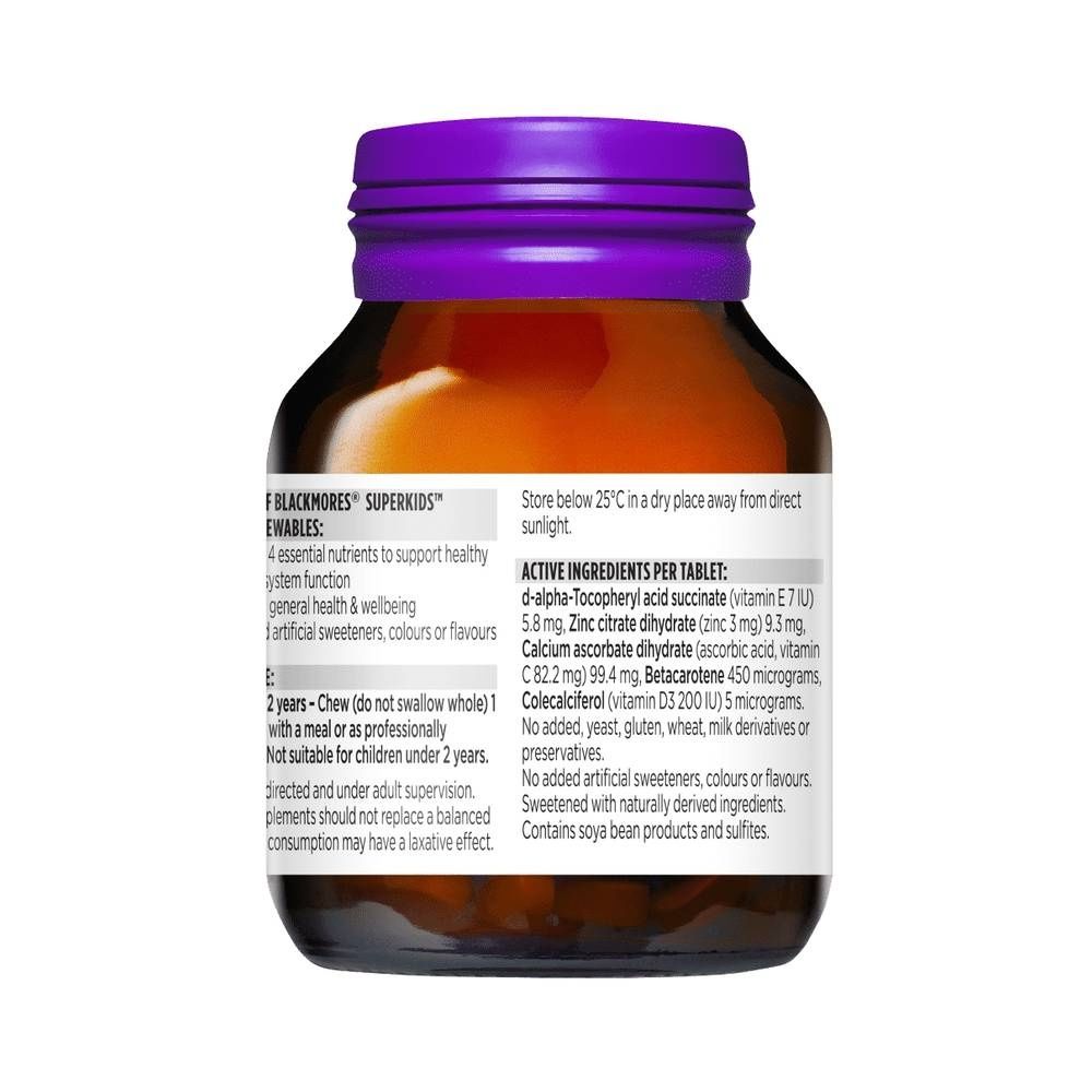 Blackmores Superkids Immune Chewables are a great-tasting natural citrus flavoured supplement to support kids’ immune health. Contains zinc, vitamins C, D & E and no added sugar they also help support general health and wellbeing. Free from artificial colours, flavours and sweeteners. Always read the label and follow the directions for use. Read the warnings below before purchase. Read more