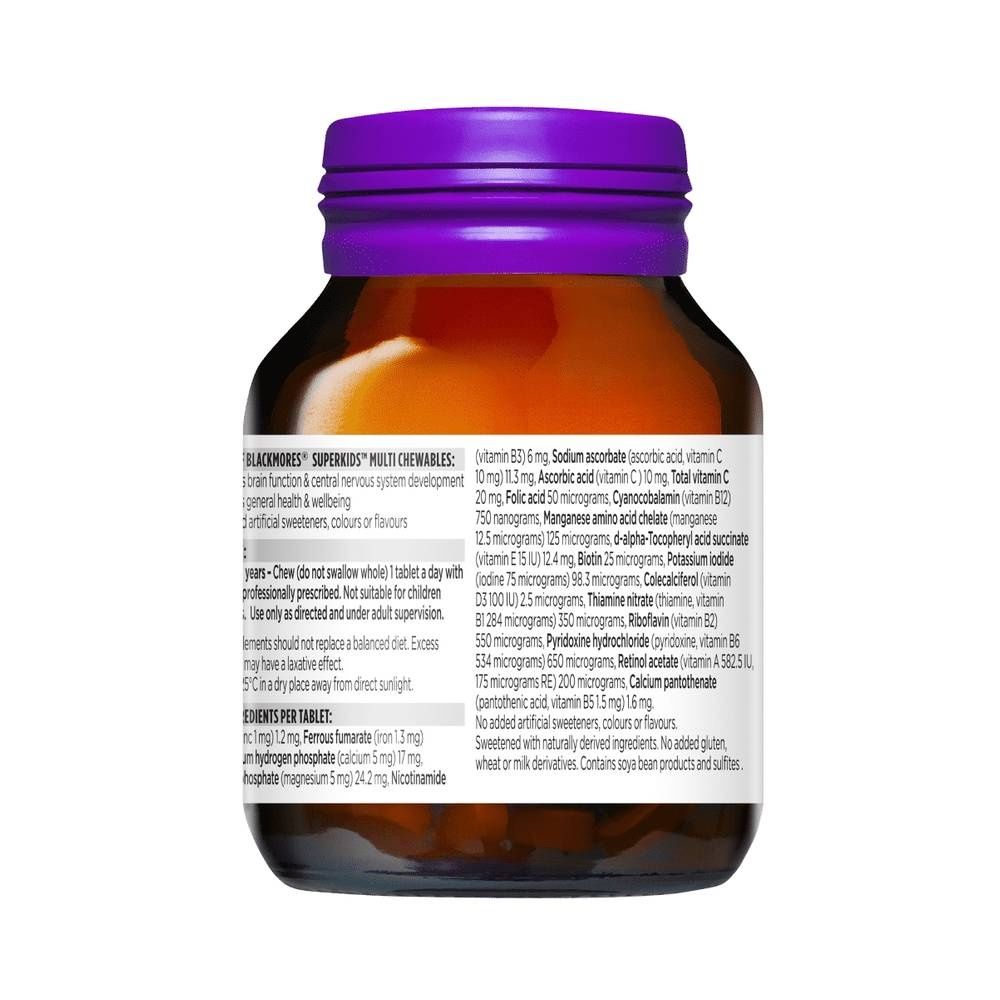 Blackmores Superkids Multi Chewables are a 99.5% sugar-free formulation containing a dose daily of 13 essential nutrients to help support kids’ healthy growth and development. Always read the label and follow the directions for use. Read the warnings below before purchase.