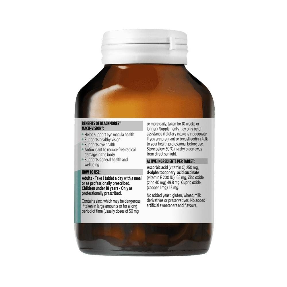 Blackmores Macu-Vision® contains antioxidant nutrients Vitamin E, Vitamin C and Zinc. It reduces free radical damage to the body and supports eye macula health and healthy vision. Always read the label and follow the directions for use. Read the warnings below before purchase. Read more