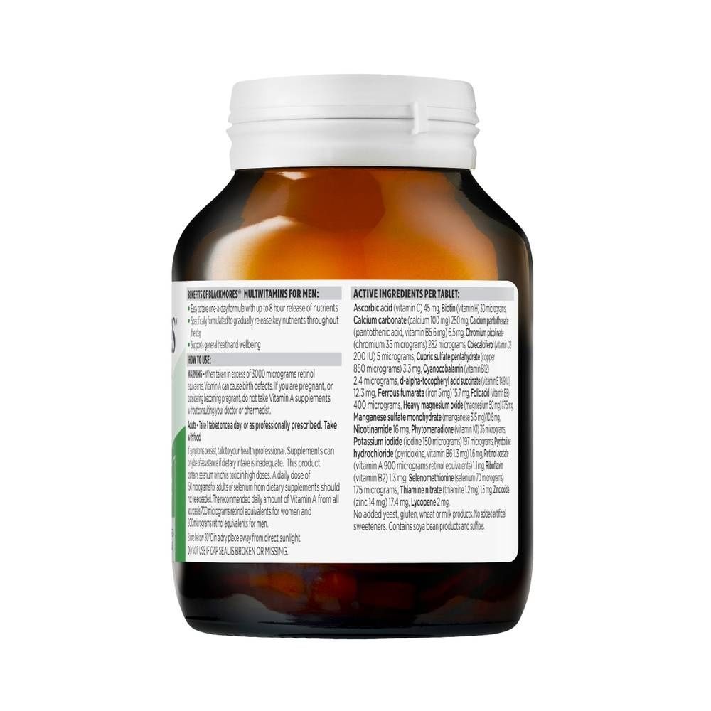 Blackmores Multivitamins for Men with Sustained Release Technology is a tailormade blend of essential vitamins & minerals for men. Always read the label and follow the directions for use. Read the warnings below before purchase. Read more
