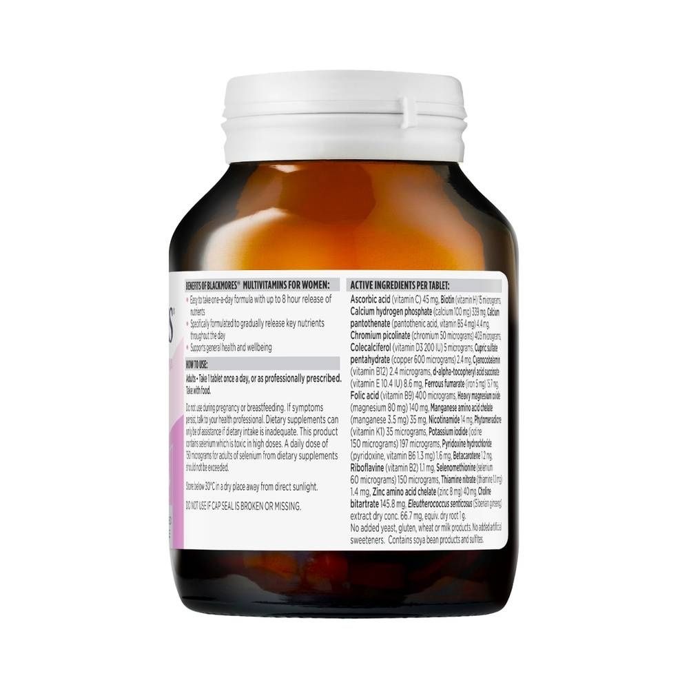 Blackmores® Multivitamins for Women with Sustained Release Technology is a tailormade blend of essential vitamins & minerals for women. Always read the label and follow the directions for use. Read the warnings below before purchase. Read more