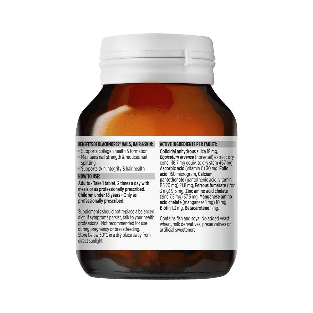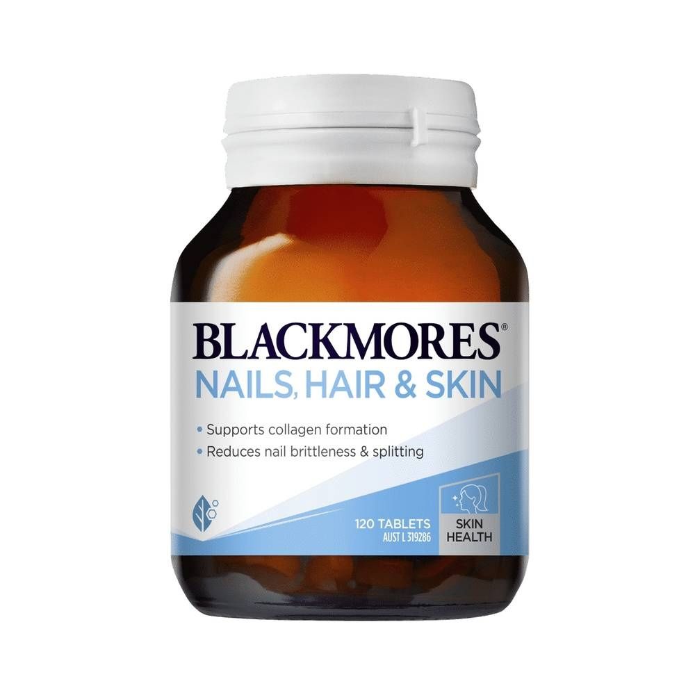 Blackmores Nails, Hair & Skin is a comprehensive formula that provides essential nutrients for healthy nails, hair and skin. It supports collagen formation and reduces nail brittleness & splitting. Always read the label and follow the directions for use. Read the warnings below before purchase.