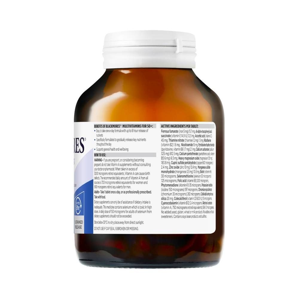 - Blackmores® Multivitamins for 50+ with Sustained Release Technology provides a steady release of nutrients to give you lasting energy for up to 8-hours a day.
