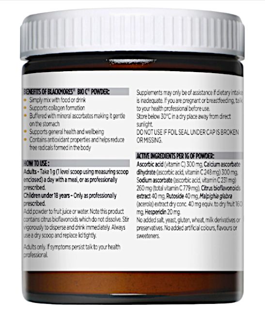 Blackmores BIO C® Powder is buffered with mineral ascorbates to give you a vitamin C that’s gentle on the stomach and has added bioflavonoids thought to support the efficacy of vitamin C. It contains acerola cherry which is a good source of vitamin C.