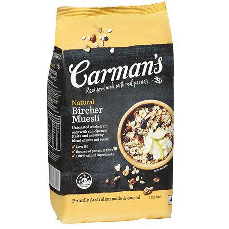 Carman's Muesli | Natural Bircher - Make mornings count with a bowl of Carman’s Natural Bircher muesli – a luxurious blend of Australian whole grain oats, sun-ripened vine fruits and crunchy gourmet nuts and seeds that can be enjoyed fresh or soaked overnight for a tasty grab-and-go breakfast!