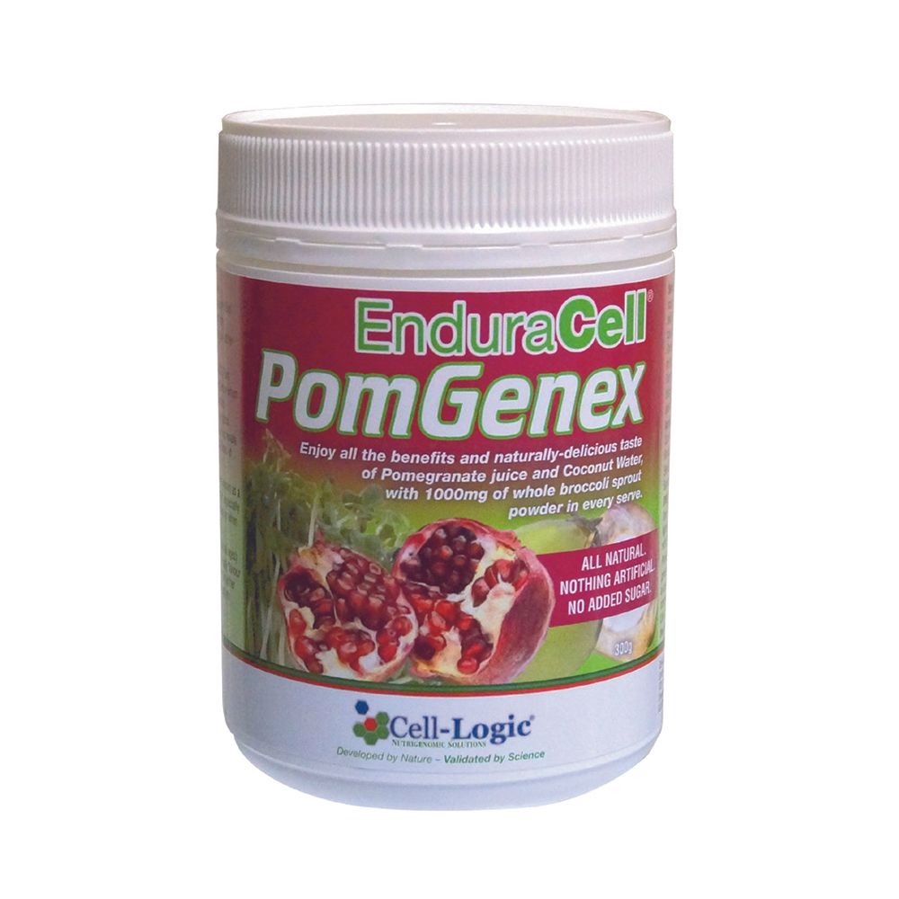 PomGenex is a unique and delicious functional food powder combining three of Nature’s most highly-prized plant foods; broccoli sprouts, pomegranate juice and coconut water. Each delicious serve of reconstituted PomGenex contains 1000 mg of EnduraCell® 100% Whole Nutraceutical Grade Enzyme-Active broccoli sprout powder, the equivalent of a half-glass (120 mL) of fresh pomegranate juice, 40 mL of coconut water and just a touch of natural vanilla.