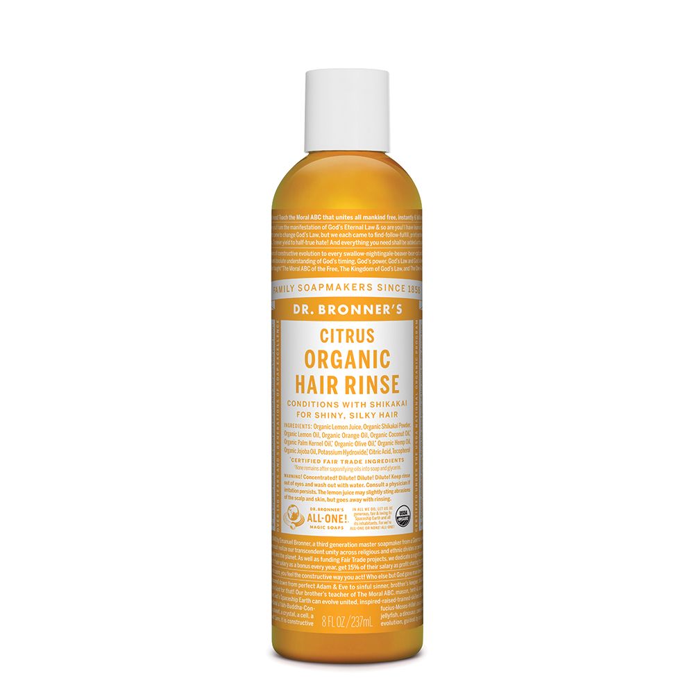 Use Dr. Bronner’s Organic Hair Rinse as part of an organic hair care routine, together with any of our soaps! After shampooing with Dr. Bronner’s soap, dilute Organic Hair Rinse in 1 cup water and pour it over hair. The citrus extracts in the rinse help to counteract the soap's alkalinity & tamp down the cuticles in your hair – leaving your hair manageable and smooth!