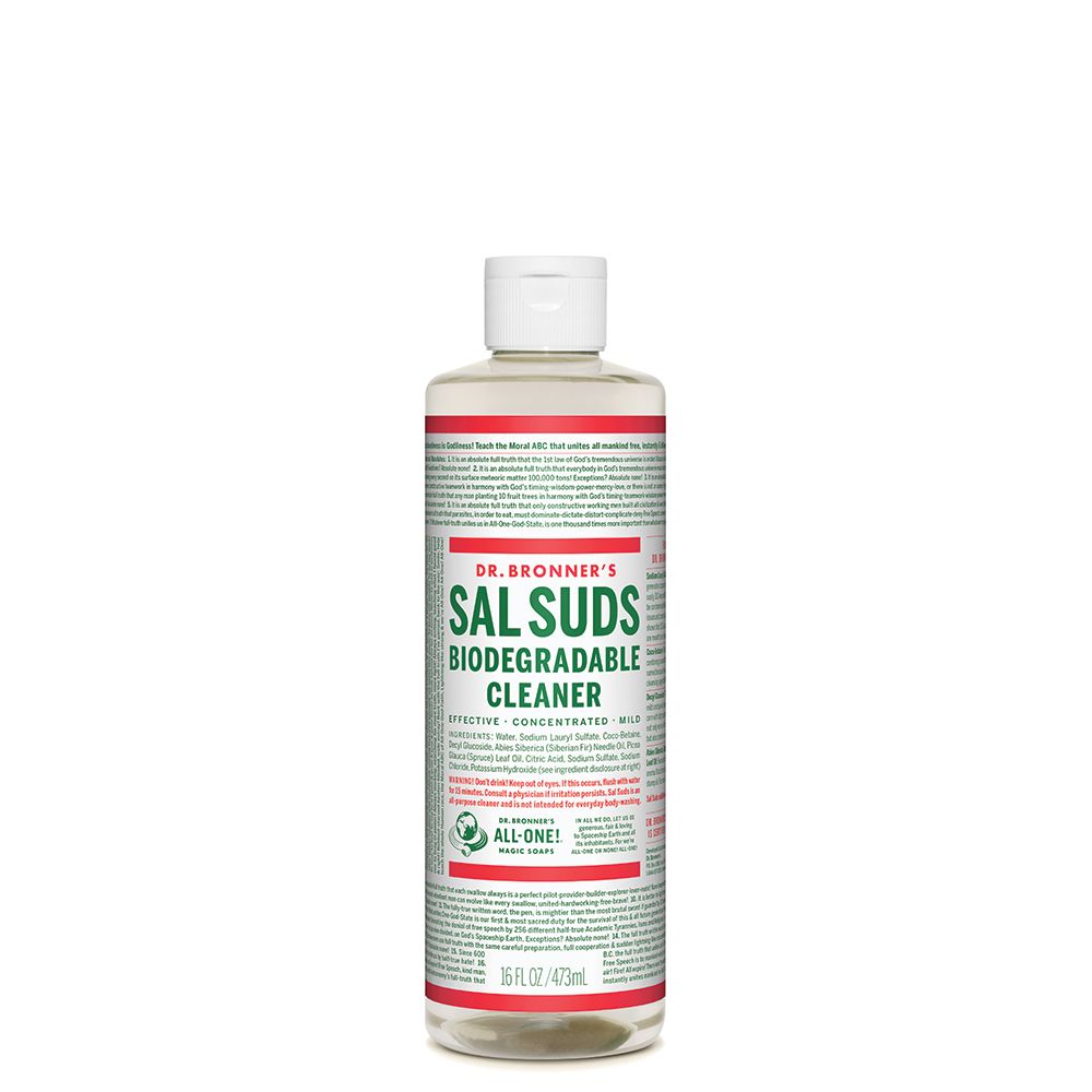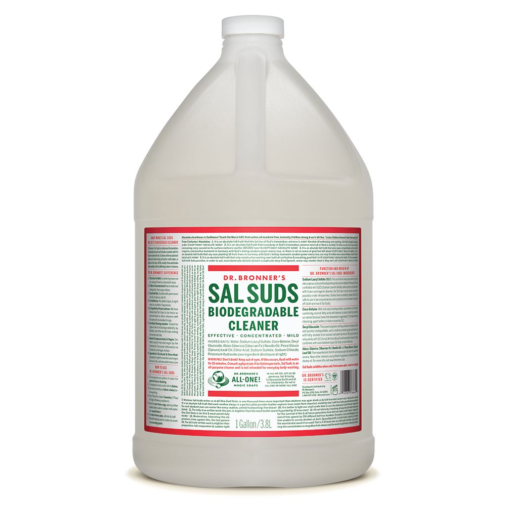 Dr. Bronner's Sal Suds Liquid Cleaner is not a soap but instead is a concentrated hard-surface all-purpose cleaner. It is made with plant-based surfactants and natural fir needle and spruce essential oils (no cheap, harsh pine stump oil), without any synthetic dyes, fragrances or preservatives. Perfect for general household cleaning (dishes, floors, laundry, etc.), it cleans and rinses with exceptional power, yet it is mild and gentle on the skin. Sal Suds Liquid Cleaner is equally effective in hard or soft water, rinsing freely, hot or cold. It is 100% cruelty-free, as certified by the Coalition for Consumer Information on Cosmetics, and it will biodegrade rapidly after doing its job.