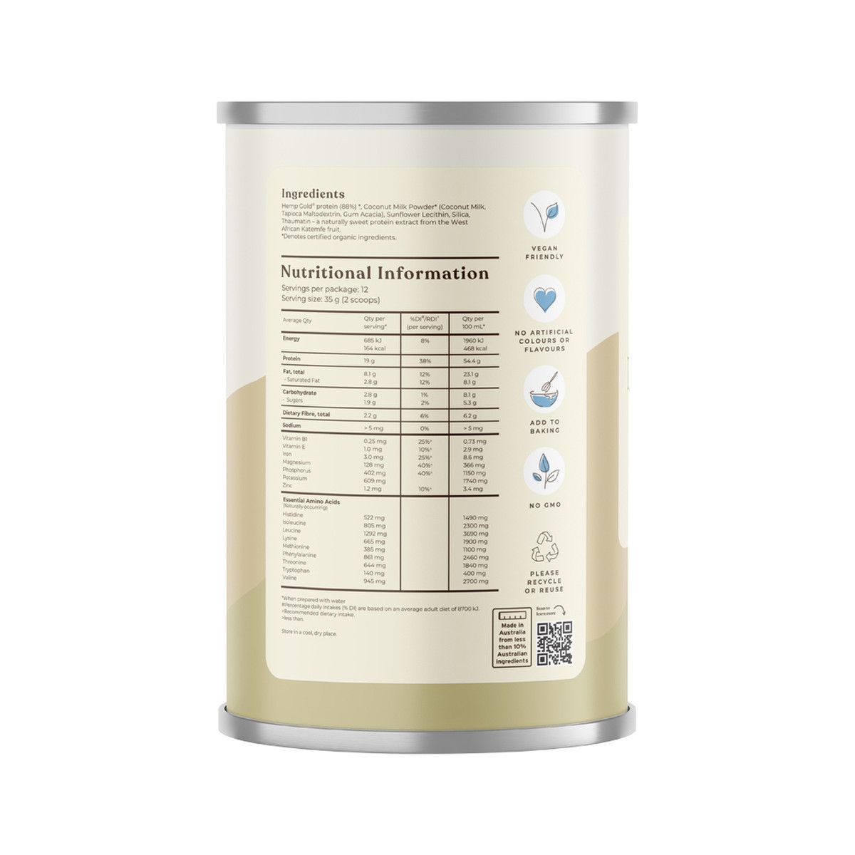 Hemp Gold™ protein (88%) *, Coconut Milk Powder*, Sunflower Lecithin, Silica, Thaumatin (0.09%) (protein extract from the West African Katemfe Fruit).