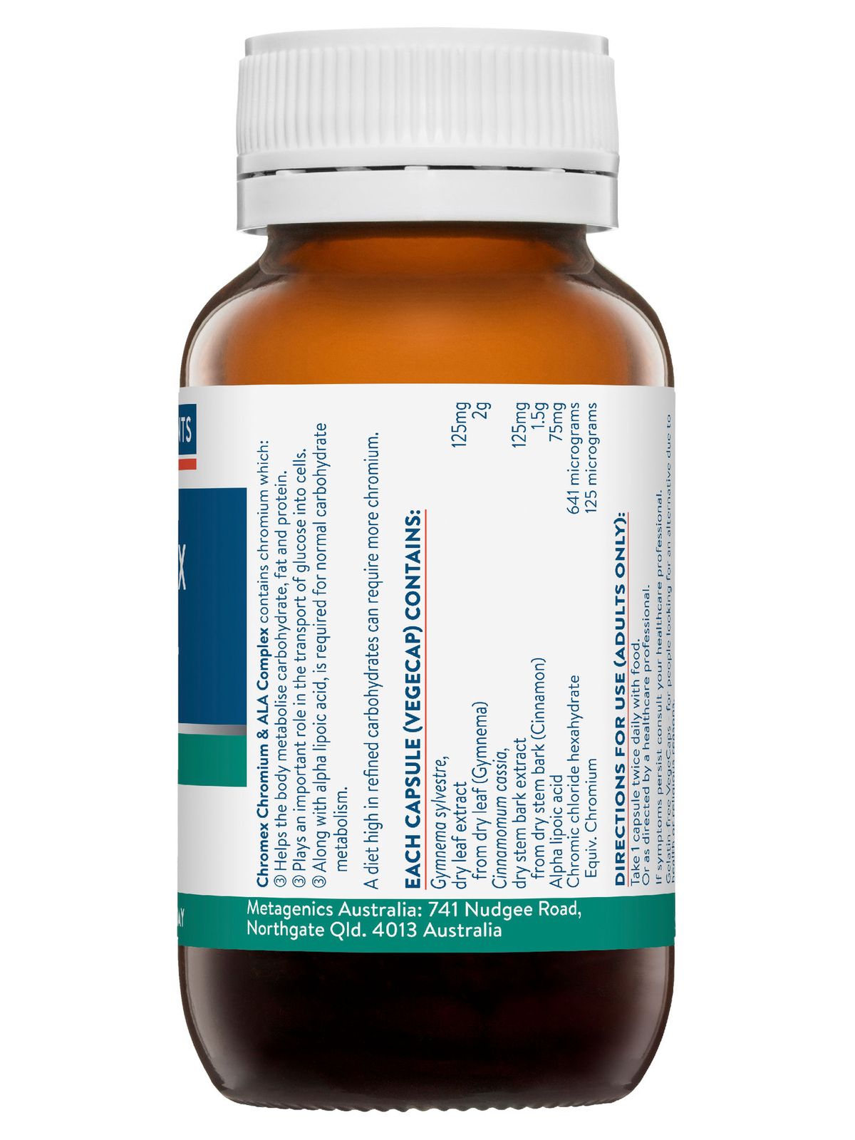 Gymnema sylvestre, dry leaf extract 125mg from dry leaf (Gymnema) 2g Cinnamomum cassia, dry stem bark extract 125mg from dry stem bark (Cinnamon) 1.5g Alpha lipoic acid 75mg Chromic chloride hexahydrate 641 micrograms Equiv. Chromium 125 micrograms