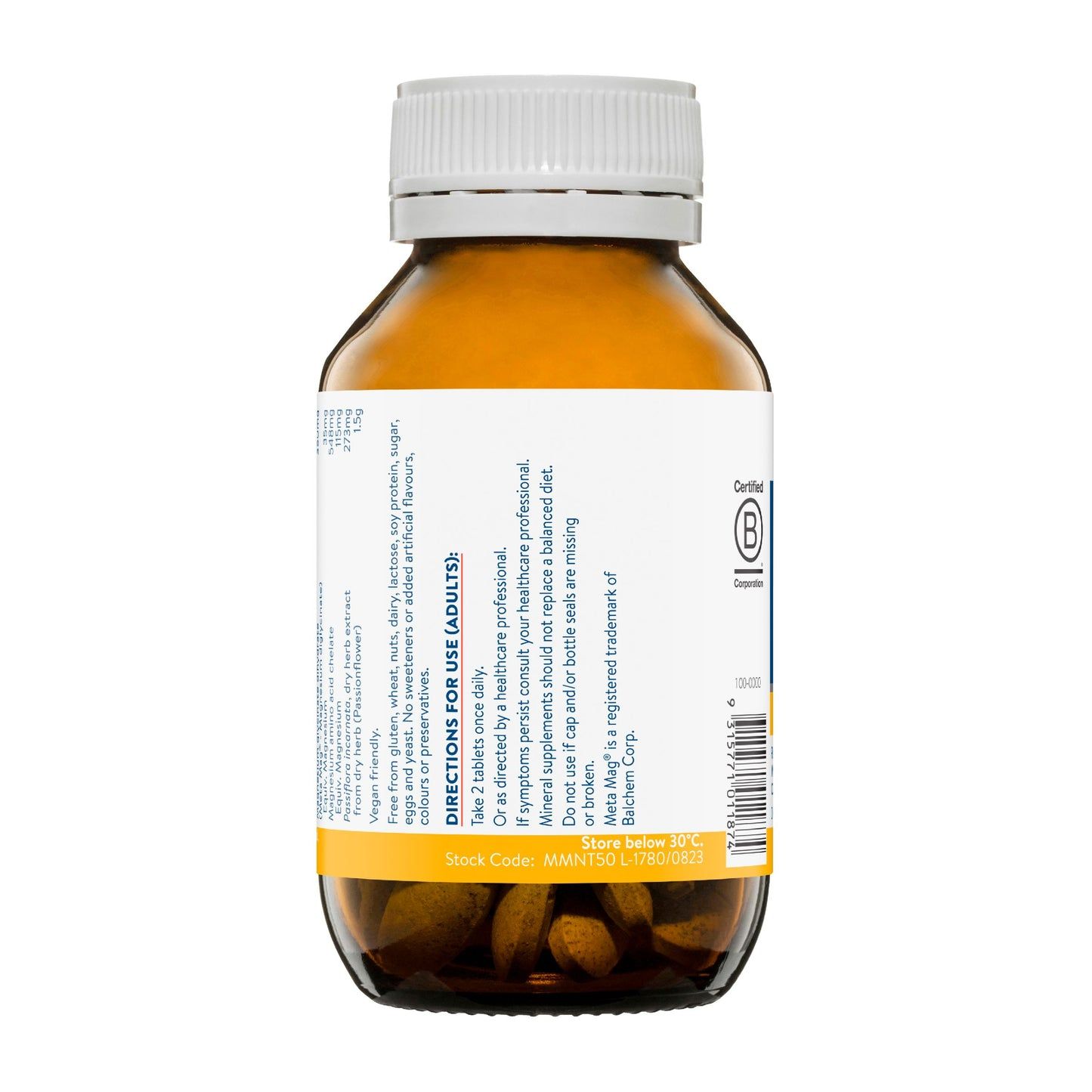 If symptoms persist consult your healthcare professional. Mineral supplements should not replace a balanced diet. Do not use if cap and/or bottle seals are missing or broken. No added artificial flavouring, colouring, or preservatives. Meta Mag® is a registered trademark of Balchem Corp.