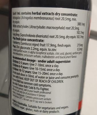 - Also contains fresh elderberry juice, equivalent to 568.5mg per 2.5mL