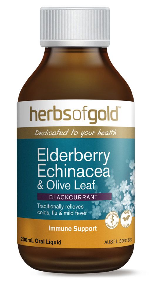 Herbs of Gold Elderberry Echinacea & Olive Leaf is a great-tasting blackcurrant liquid formulated to support healthy immune system function.