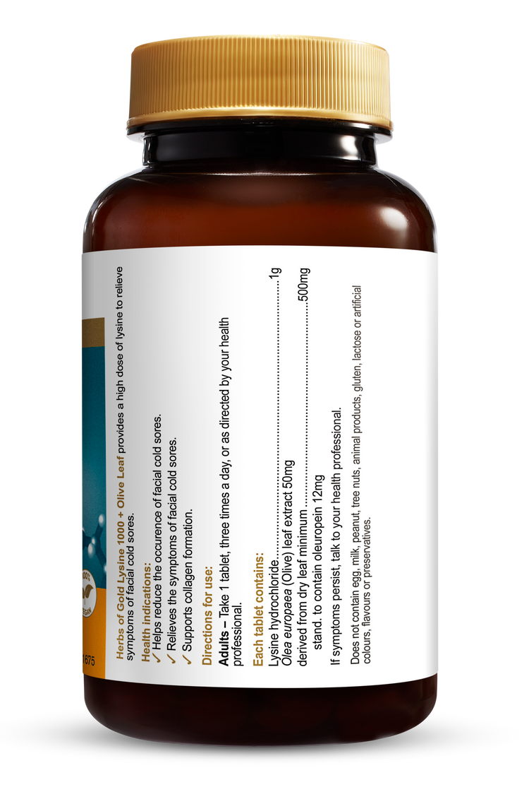 - Herbs of Gold Lysine 1000 + Olive Leaf contains 1000mg of the amino acid lysine plus a standardised extract of Olive leaf.