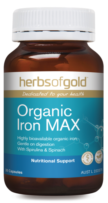 - Herbs of Gold Organic Iron MAX contains iron, folic acid and vitamins B2 and B12 to maintain haemoglobin formation and assist healthy red blood cell production to support blood health. Iron and vitamin B12 support the transport of oxygen in the body and help oxygen transport to body tissues.
