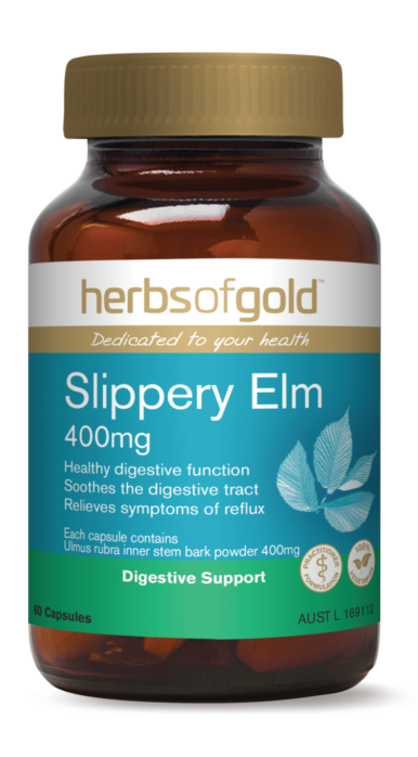 Herbs of Gold Slippery Elm 400mg supports digestive system health and healthy mucous linings of the digestive system.