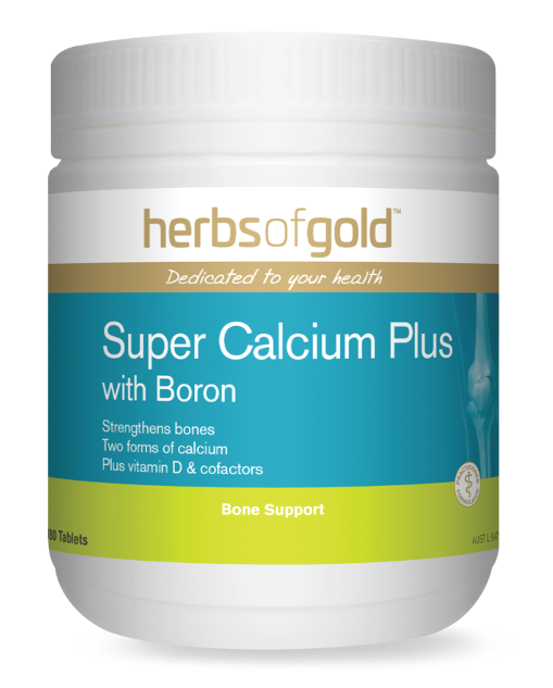 Herbs of Gold Super Calcium Plus with Boron contains calcium and vitamin D plus additional vitamins and minerals to support bone health.