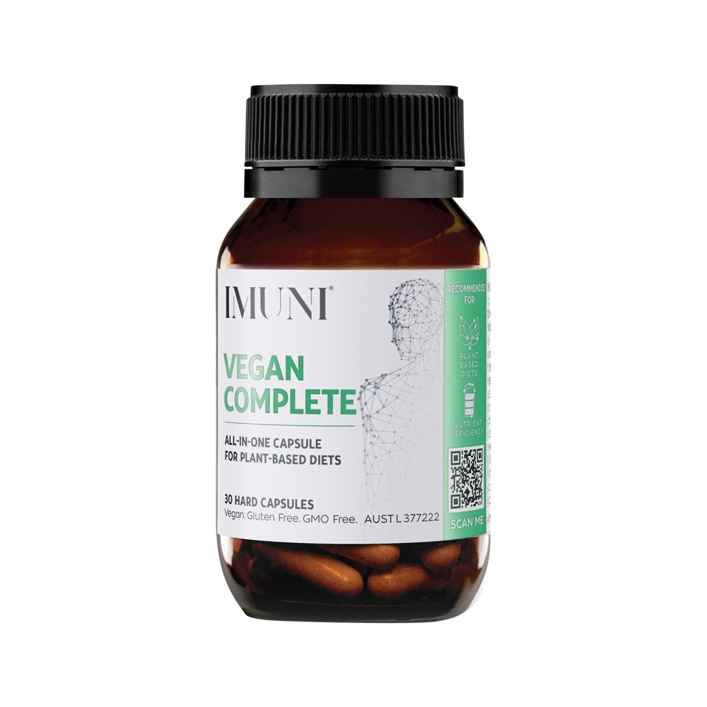 IMUNI Vegan Complete is a specialised blend of nutraceuticals designed to replenish vital nutrients often at risk of deficiency in plant-based diets. One capsule per day helps prevent dietary deficiencies in iron, zinc, B12, iodine, vitamin D and selenium.