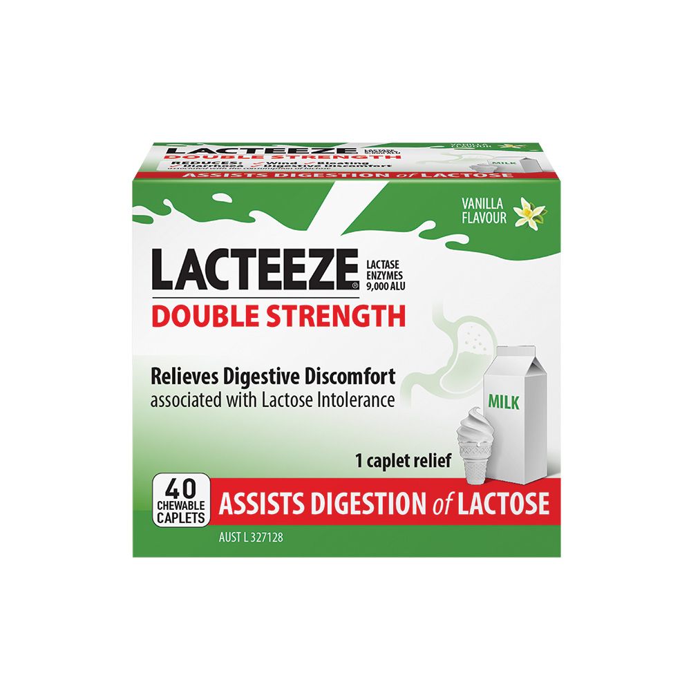 Lacteeze Double Strength Chewable caplets may provide immediate relief of gas, bloating, abdominal cramps and diarrhoea associated with the digestion of dairy. It is over double the strength of Lacteeze Extra Strength tablets. Double Strength caplets are specially formulated for adults with moderate to severe lactose intolerance. It temporarily increases the amount of lactase enzymes in the digestive system, so that the lactose in dairy can be digested naturally.