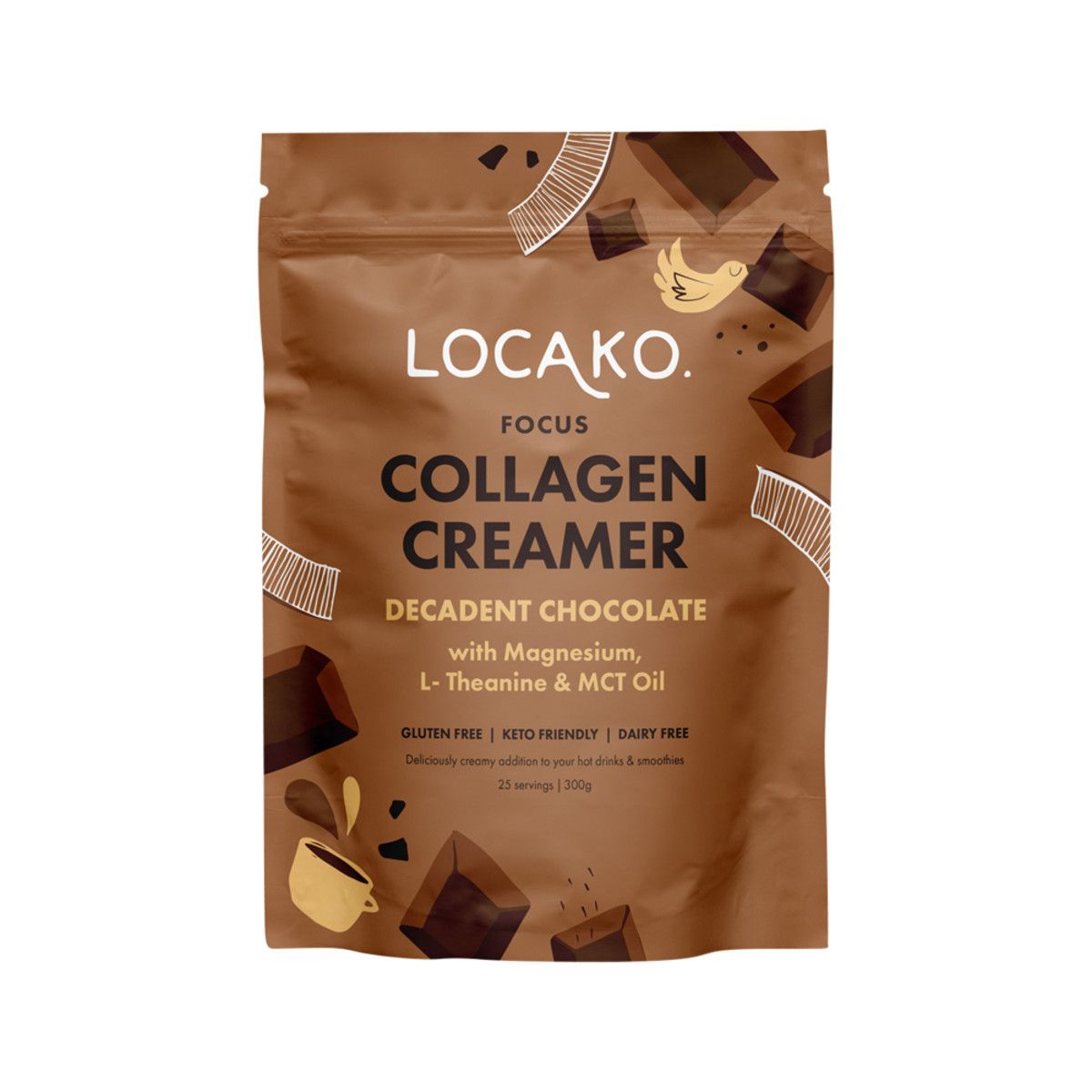 Locako’s Collagen Creamer crafted with the finest and cleanest ingredients with Collagen, MCTs, Coconut Milk Powder to help ketone production, help improve focus and perfect as a morning mocha or calming chocolatey night cap.