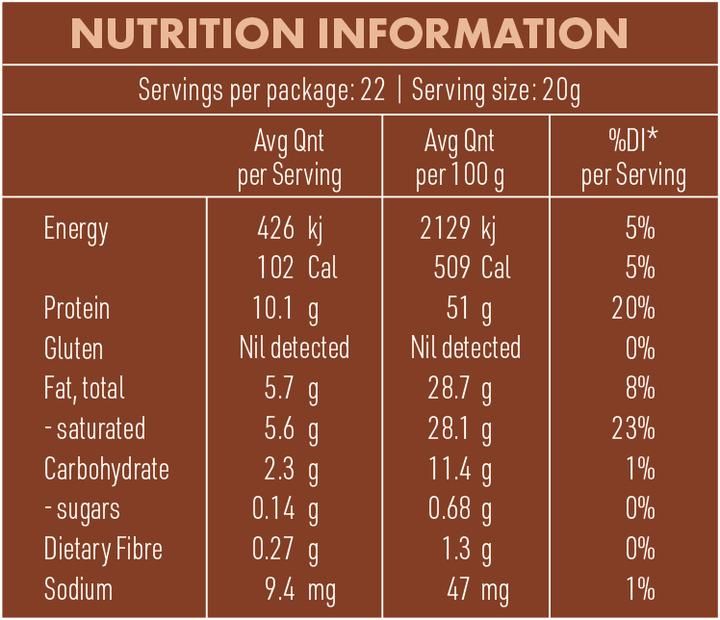 Pasture Raised Collagen, Coconut MCT Oil Powder, (MCT Oil, Acacia), Raw Cacao Powder, Natural Flavours (Caramel, Chocolate), Alkalised Cocoa, Guar Gum, Stevia