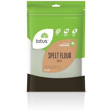 Lotus Organic White Spelt Flour is packed in Australia using local ingredients. It comes in a 1kg re-sealable oxygen barrier bag to preserve freshness.