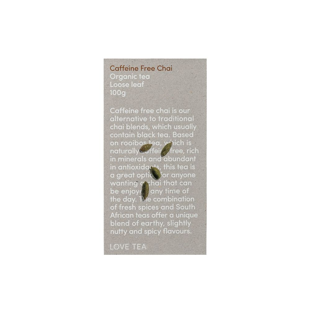 Caffeine free chai is an alternative to traditional chai blends, which usually contain black tea. Based on rooibos tea, which is naturally caffeine free, rich in minerals and abundant in antioxidants, this tea is a great option for anyone wanting a chai that can be enjoyed any time of the day. The combination of fresh spices and South African teas offer a unique blend of earthy, slightly nutty and spicy flavours.