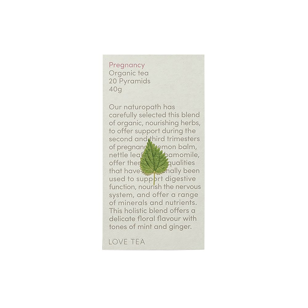 The Love Tea naturopath has carefully selected this blend of organic, nourishing herbs, to offer support during the second and third trimesters of pregnancy. Lemon balm, nettle leaf and chamomile, offer therapeutic qualities that have traditionally been used to support digestive function, nourish the nervous system, and offer a range of minerals and nutrients. Love Tea organic Pregnancy Tea is a holistic blend offering a delicate floral flavour with tones of mint and ginger.