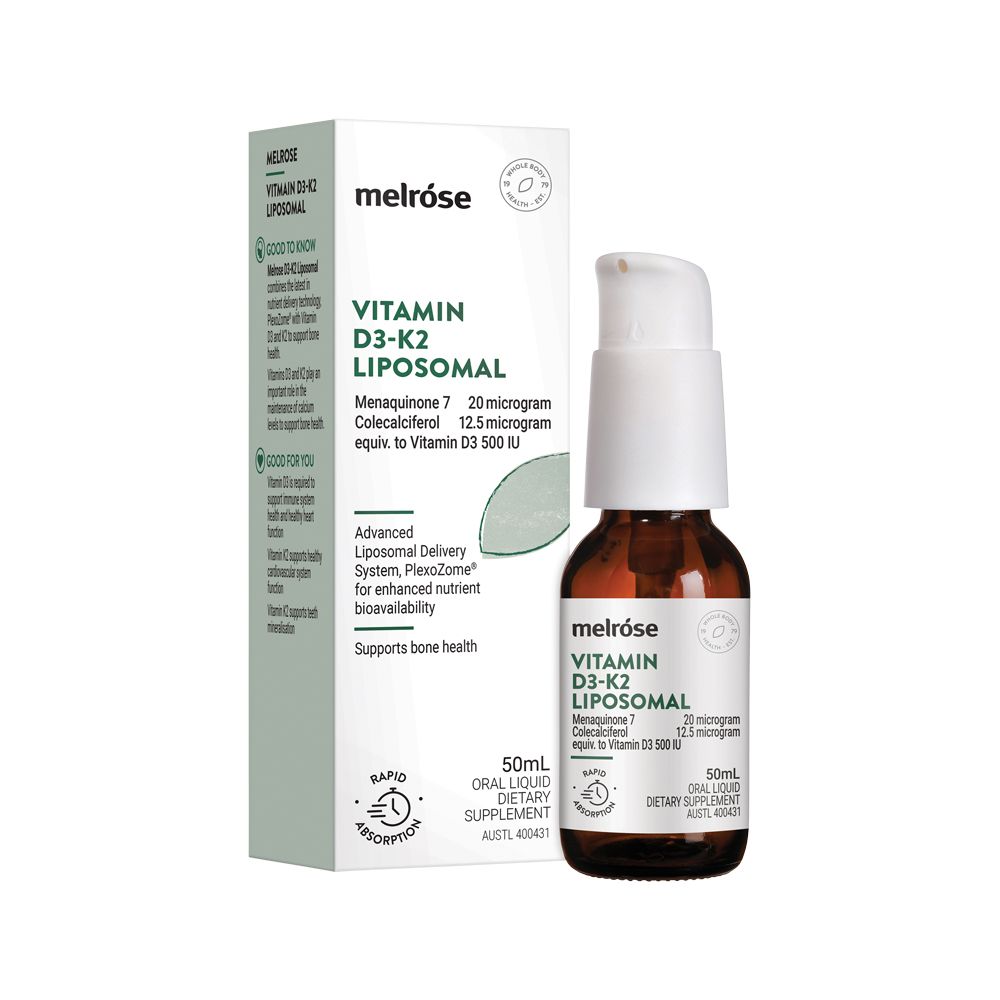 Melrose Liposomal Vitamin D3-K2 combines that latest in nutrient delivery technology, Plexozome™ with Vitamin D3 and K2 to support bone health. Unlike traditional forms of vitamins, liposomal technology uses a unique delivery system that allows enhanced absorption and effectiveness. Read more
