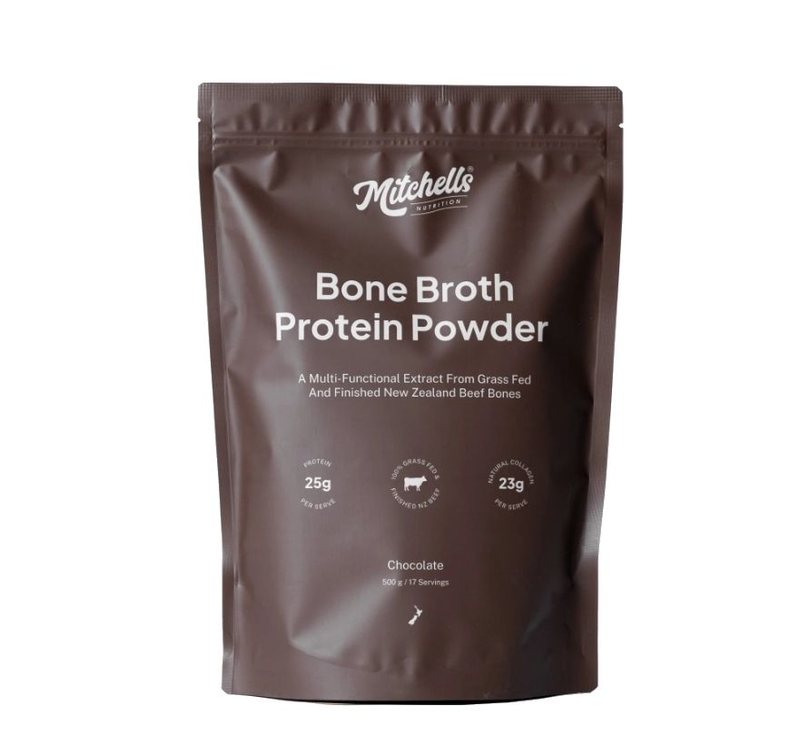 Grass-fed New Zealand bone broth protein 88% (extract from grass-fed beef bones), cocoa powder, natural vanilla flavour, sweetener (monk fruit powder).