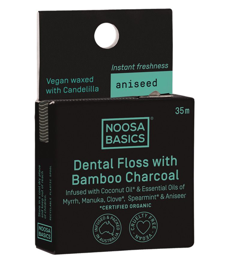 Noosa Basics Bamboo Charcoal Dental Floss is infused in a blend of Organic Virgin Coconut Oil and 100% Pure Essential oils of Myrrh, Manuka, Clove, spearmint & Aniseed. Read more