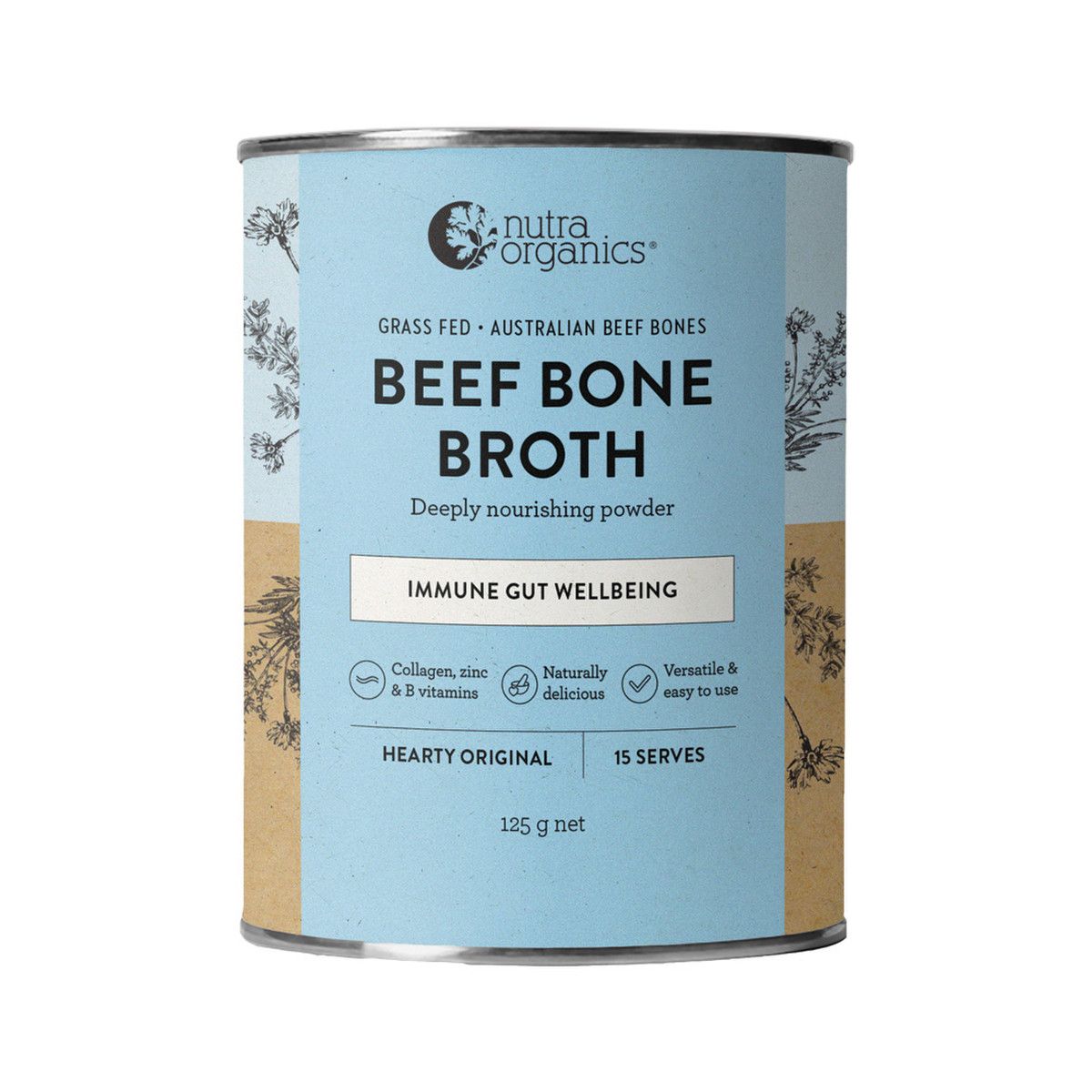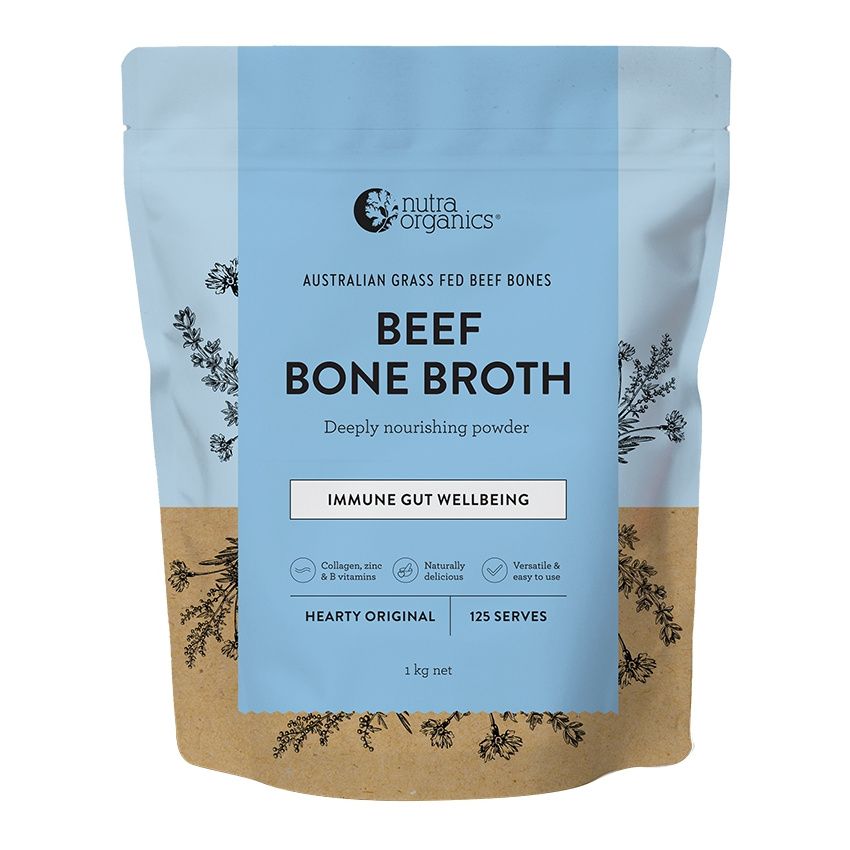Nutra Organics Beef Bone Broth Hearty Original is naturally nourishing with a source of protein and collagen, Zinc, and B vitamins.