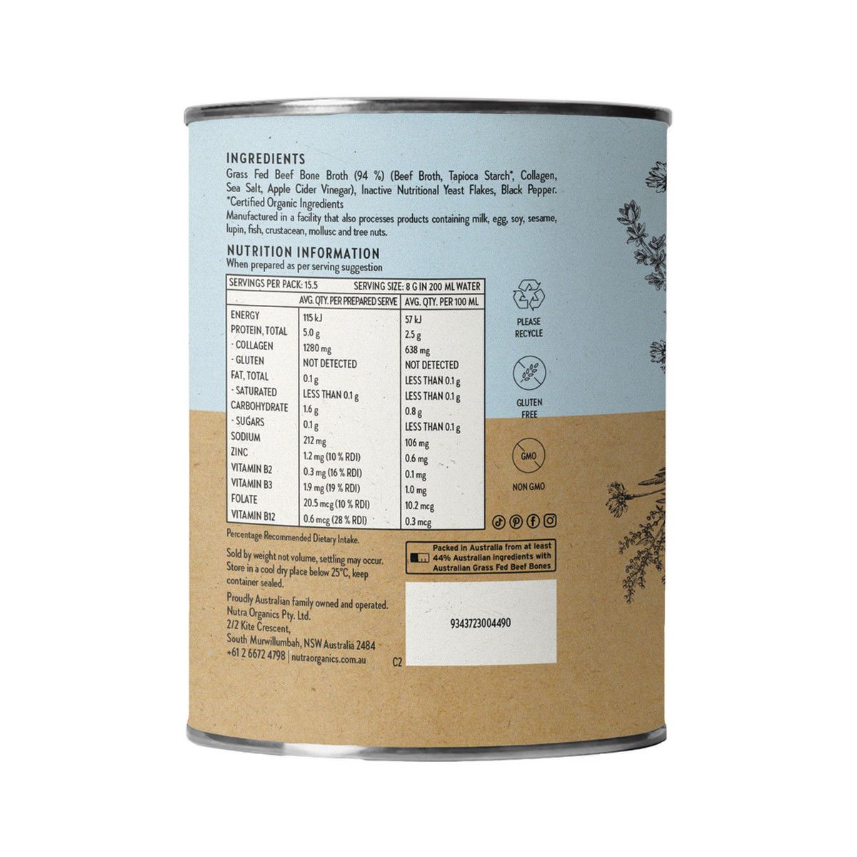Grass Fed Beef Bone Broth (77 %) (Beef Bones, Beef Broth, Collagen, Pacific Sea Salt, Apple Cider Vinegar*), Tapioca Starch*, Deactivated Nutritional Savoury Flakes, Black Pepper. *Certified Organic Ingredients