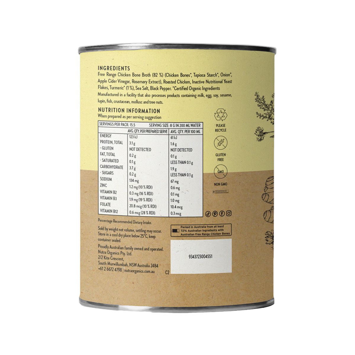 Australian Free Range Chicken Bone Broth* (74 %) (Chicken Bones*, Onion*, Apple Cider Vinegar*), Roasted Chicken, Tapioca Starch*, Deactivated Nutritional Savoury Flakes, Turmeric* (1 %), Pink Himalayan Salt, Black Pepper, Rosemary Extract. *Certified Organic Ingredients