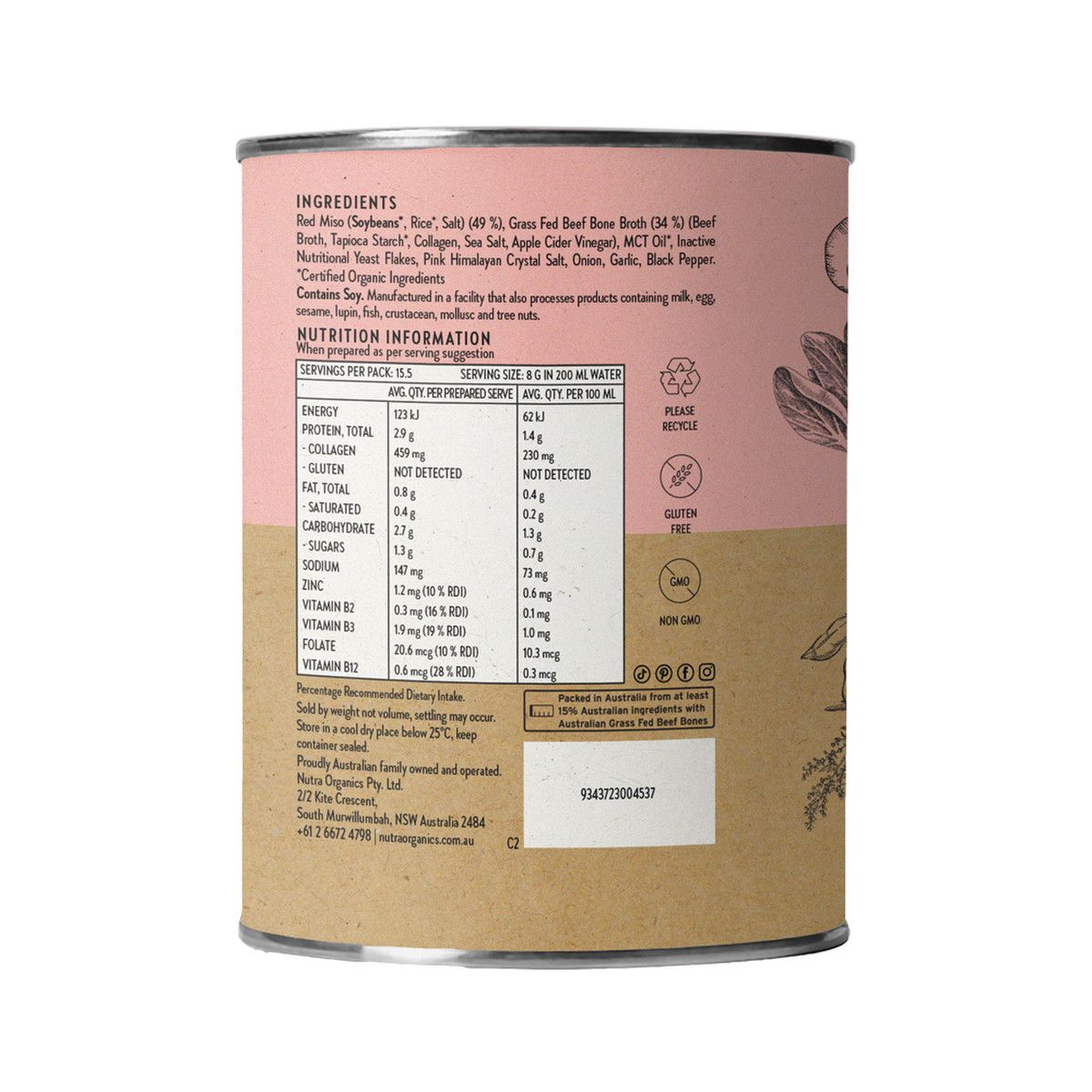 Red Miso* (49%) (Soybeans*, Rice*, Salt, Aspergillus oryzae*), Grass Fed Beef Bone Broth (28%) (Beef Bones, Beef Broth, Collagen, Pacific Sea Salt, Apple Cider Vinegar*), MCT Oil*, Deactivated Nutritional Savoury Flakes, Tapioca Starch*, Pink Himalayan Salt, Onion, Garlic, Black Pepper. *Certified Organic Ingredients