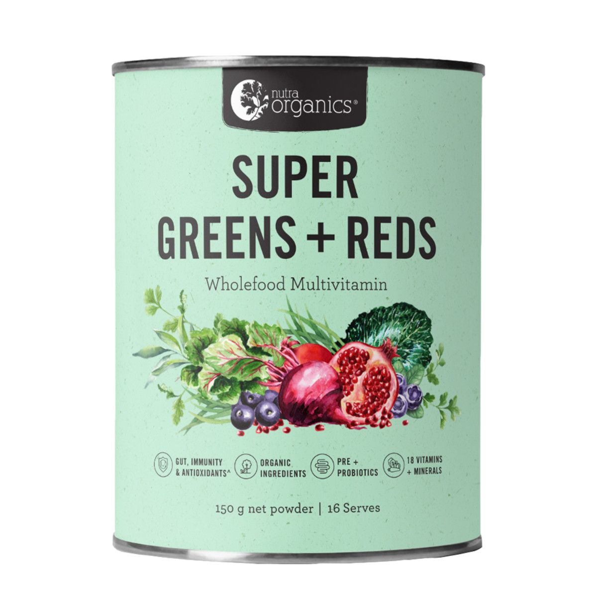 Nutra Organics Super Greens + Reds Powder contains a wholefood blend of 23 nourishing greens and reds to support immunity, gut wellbeing, energy, acid-alkaline balance, antioxidant protection^ and more.