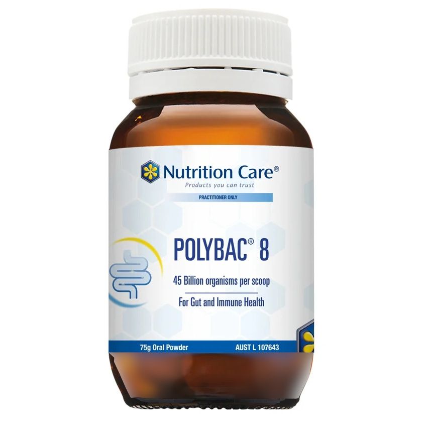 Nutrition Care Polybac® 8 assists in maintaining a normal healthy gut mucosal barrier function, intestinal immune function and a healthy balance of intestinal microflora.