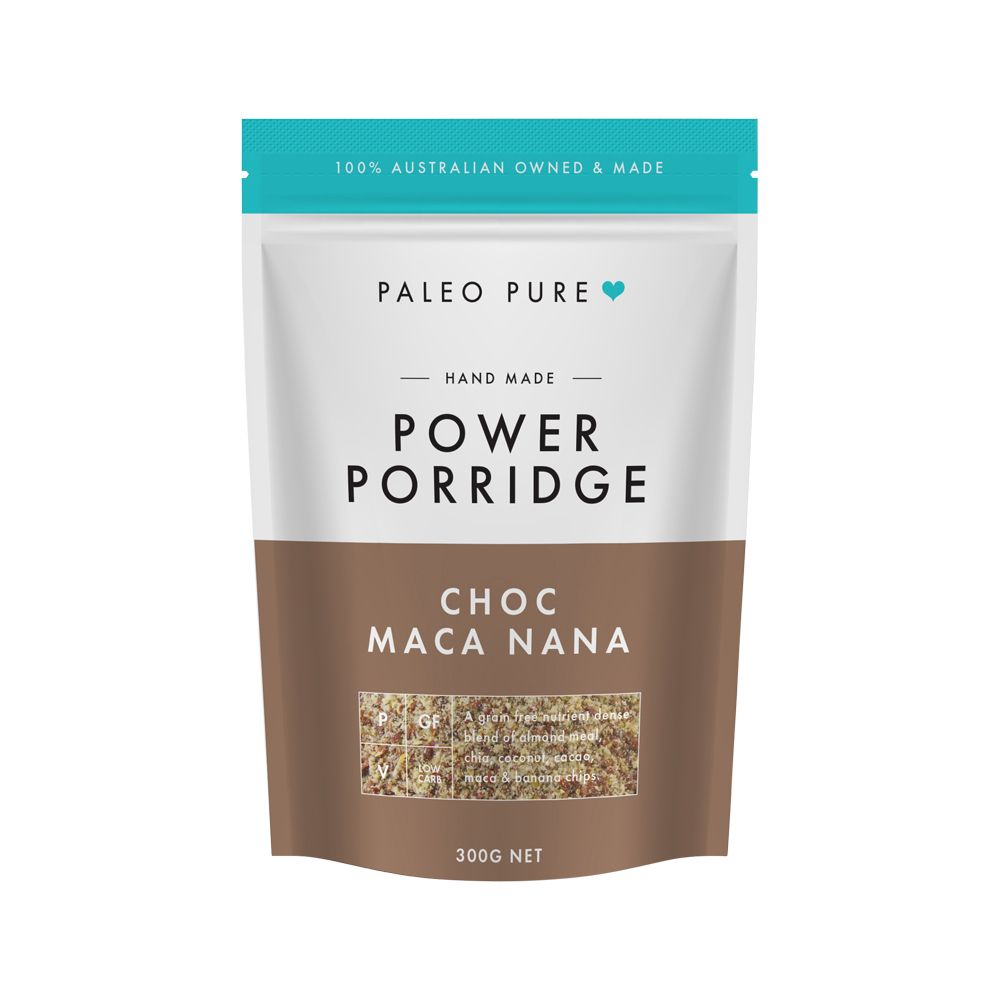 Going grain free doesn't mean you have to miss out on all the good stuff, like a delicious creamy porridge. Our power porridge is made completely by hand with super clean ingredients such as almond meal, chia seeds and coconut. By adding raw organic cacao & maca powder AND banana chips, this flavour will be a winner for chocolate lovers. Our Power Porridge range can be eaten warm or cold, the choice is yours.