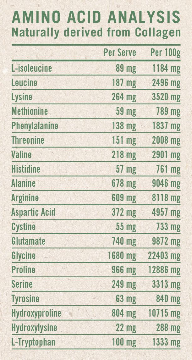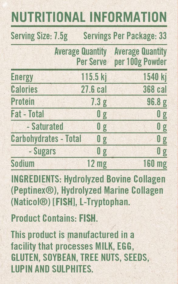 Hydrolyzed Bovine Collagen (Peptinex®), Hydrolyzed Marine Collagen (Naticol®) [FISH], L-Tryptophan.