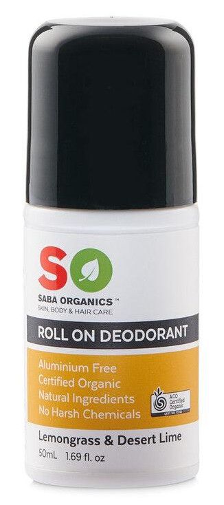 Saba Organics Roll On Deodorant is Certified Organic, aluminium free and made from natural ingredients. Lemongrass & Desert Lime.