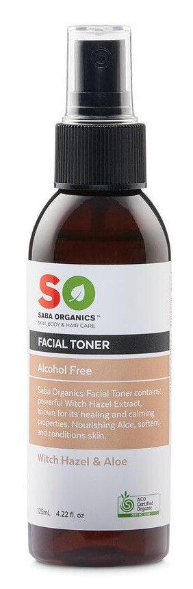 Saba Organic Facial Toner contains powerful Witch Hazel Extract, known for its healing and calming properties. Nourishing Aloe softens and conditions skin.